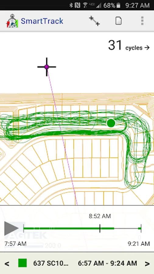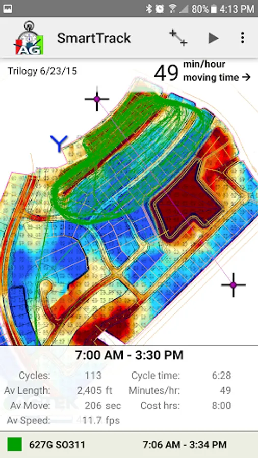A mobile tool for managing production in the field, SmartTrack displays real time equipment tracks from simple 4D Sensors, on a geo-referenced cut-fill grid map or plan sheet, and provides your foreman or project manager with a current measure of his load counts, cycle lengths, cycle times, moving time, stopped time and location of the tracked equipment.