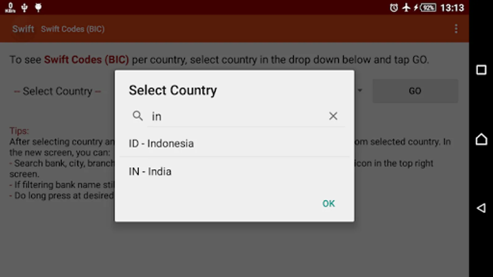 After selecting the desired country, you can search bank, city, branch, even the Swift Codes itself, by accessing provided search action.