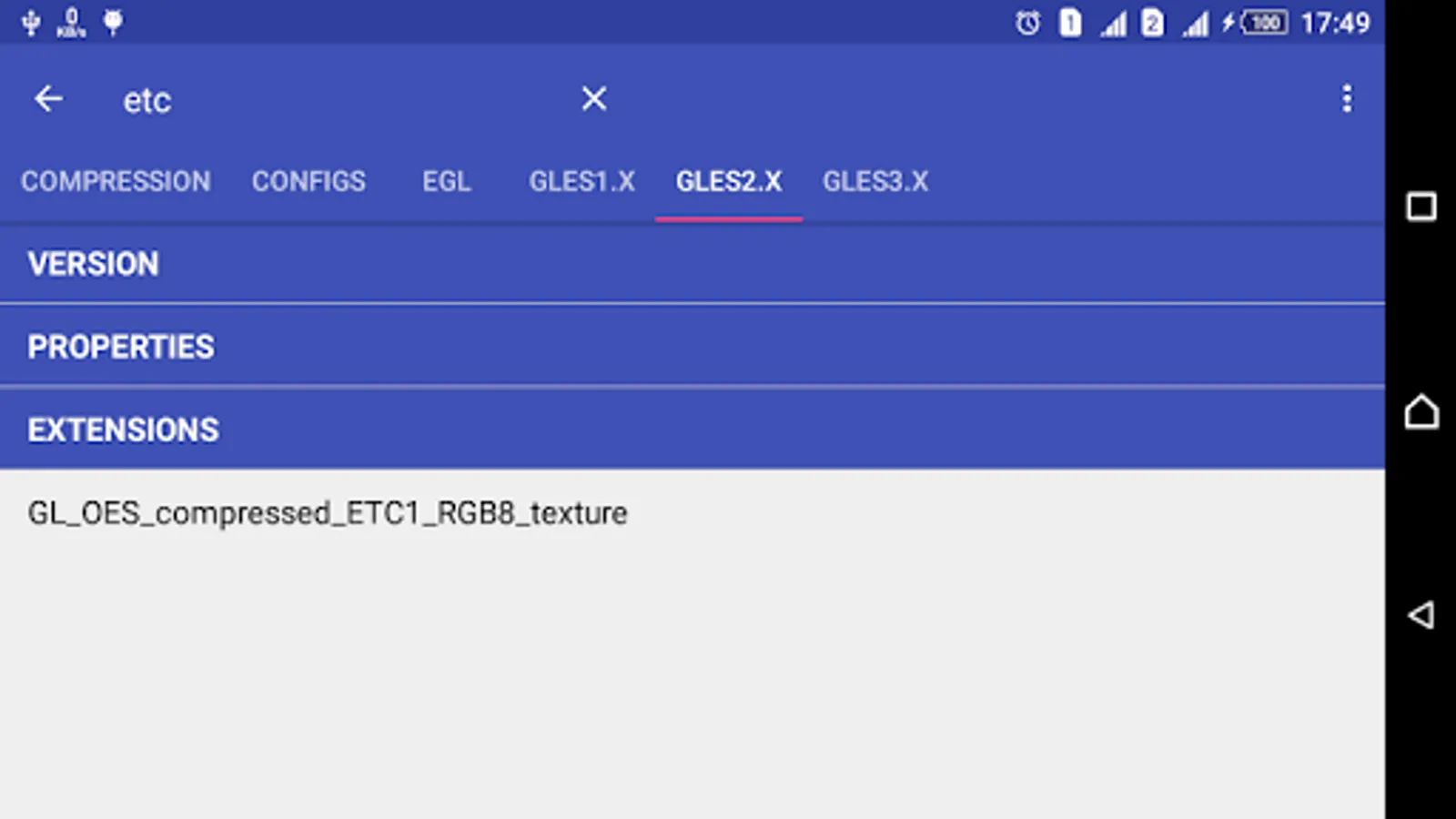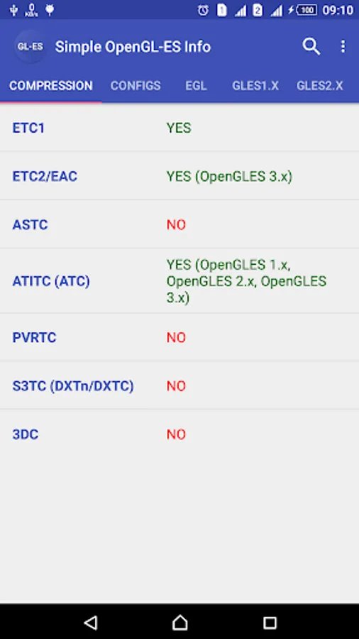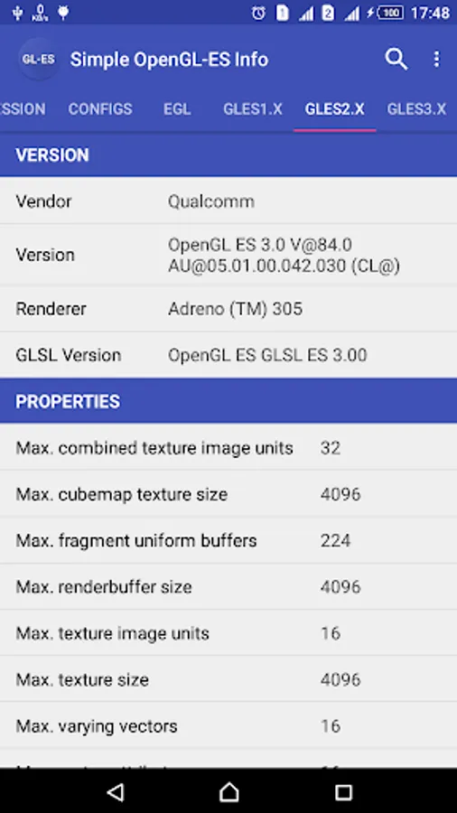 - EGL, GLES1.x, GLES2.x, and GLES3.x information, including version, properties and extension.