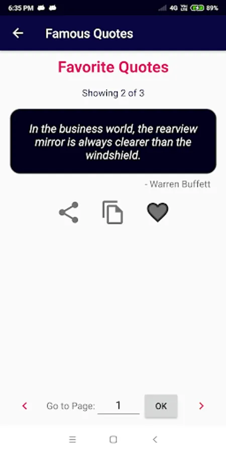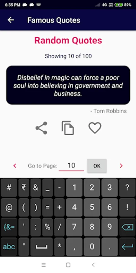 around the world, it also has 100+ Categories to read from. You have the option to save your favorite quotes, and also you can share the quote you like with your friends. 100+ Categories such as Money, Love, Marriage, Life, etc., Famous people quotes like Abdul Kalam, Abraham Lincoln, Warren Buffett, etc., Easy navigation between quotes - Swipe, click, go to, etc.,