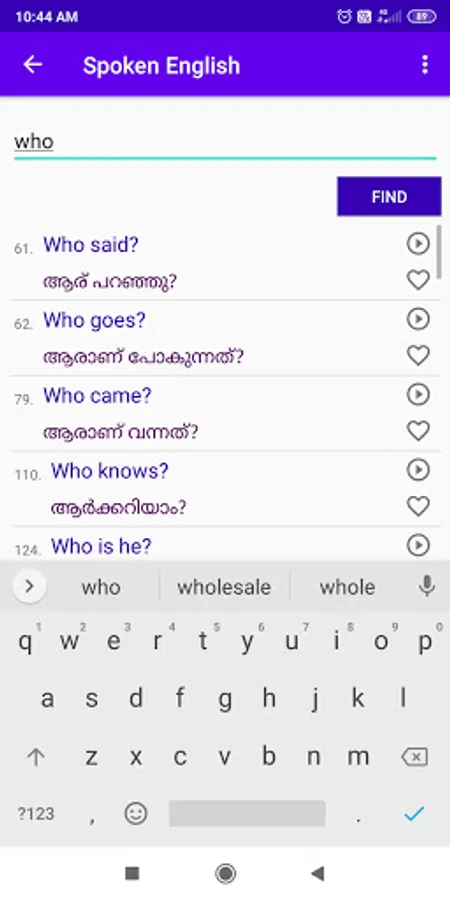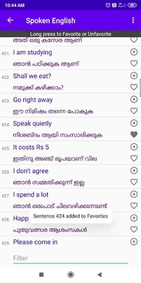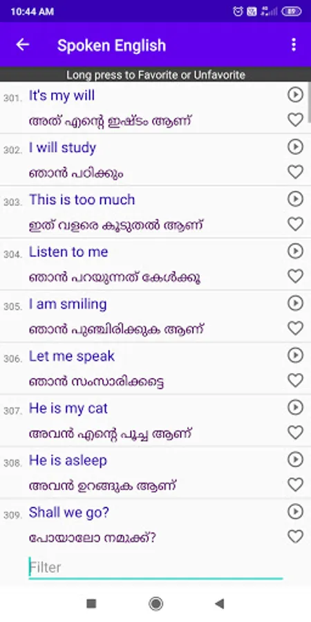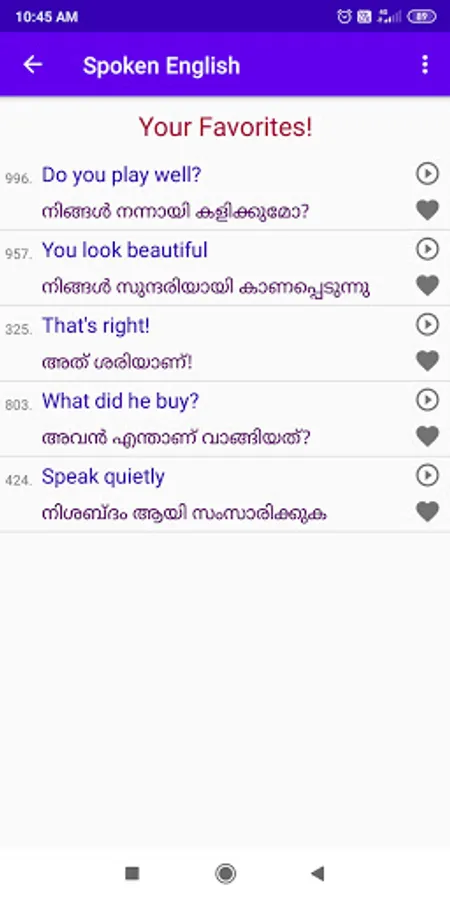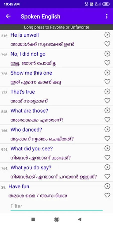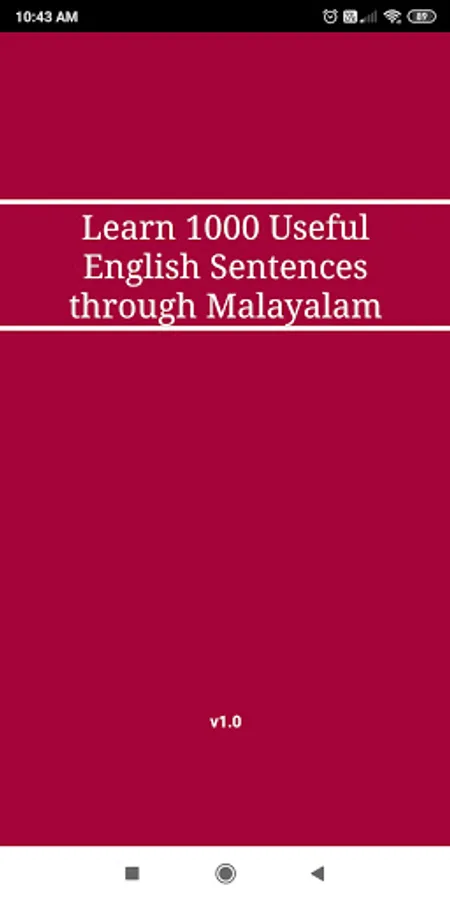 This application helps you to learn 1000 Useful English sentences through Malayalam which are used in our daily life. This app has crystal clear audio so you can learn the proper English pronunciation (Indian Accent). It has a lot of useful features such as,