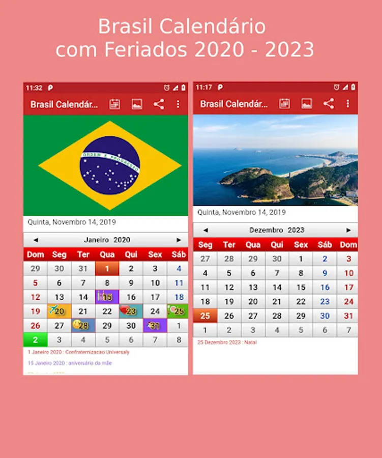 Brasil Calendário 2023 com feriados de 2021, 2022, 2023, 2024, 2025