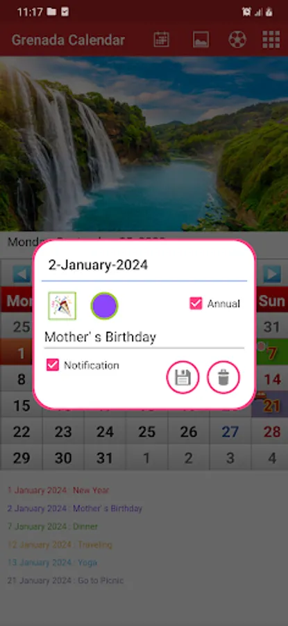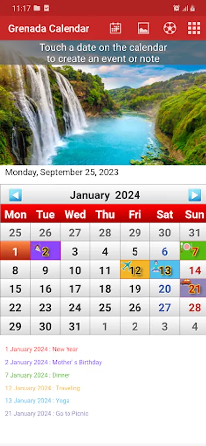 • Create event or note with icon and color.