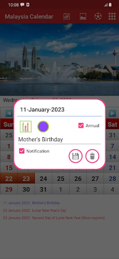 - Create event or note with icon love, ring, task, birthday and choose the background color.