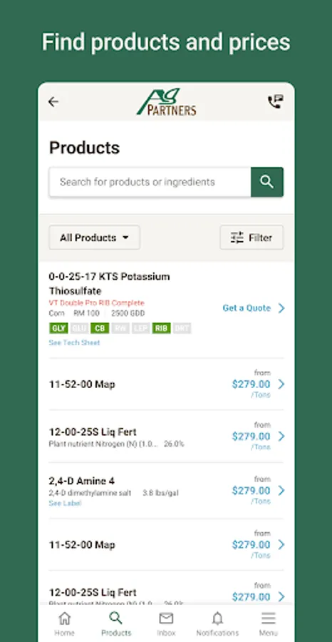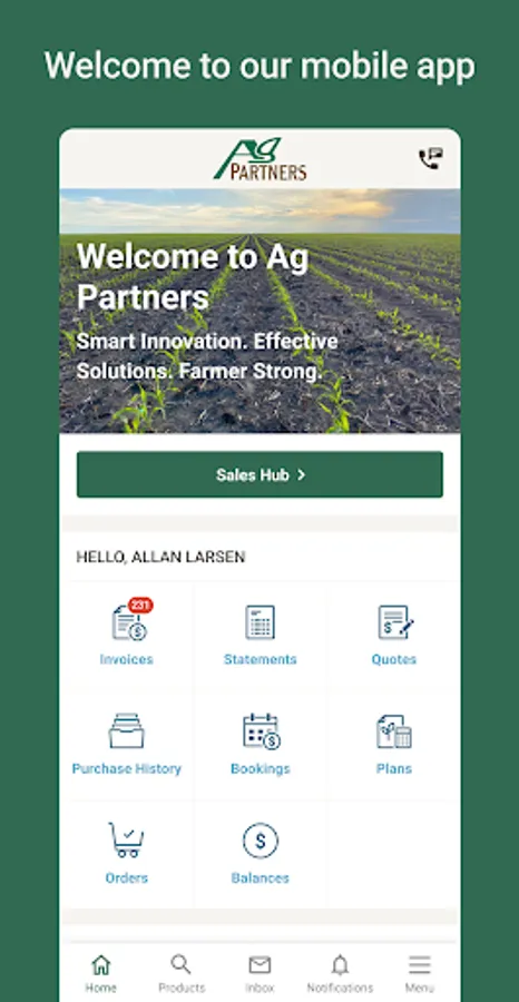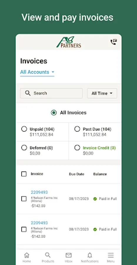 • Access your Ag Partners account information to find previous purchases, or view and pay your invoices.