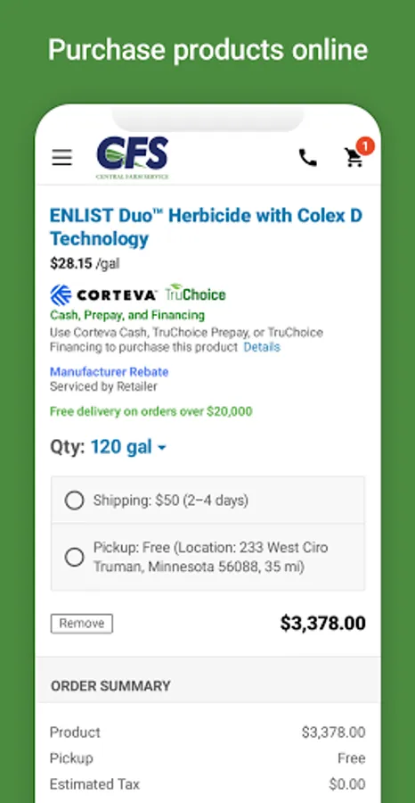 Conveniently purchase the products on your mobile device. Pay using a credit card, ACH, John Deere Financial and other options