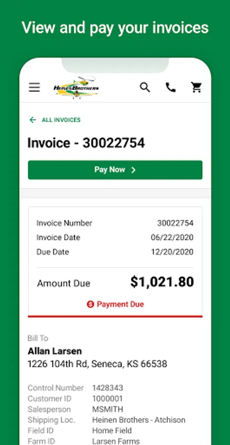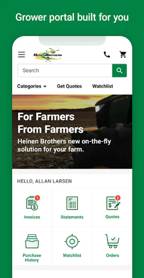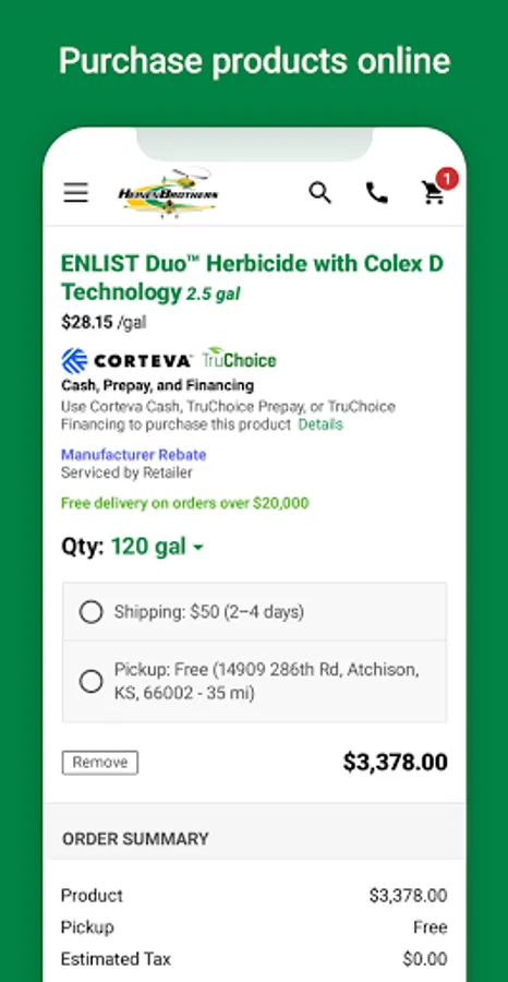 • Conveniently purchase the products on your mobile device. Pay using credit card, ACH, John Deere Financial, Rabo, or your Heinen Brothers account!