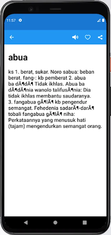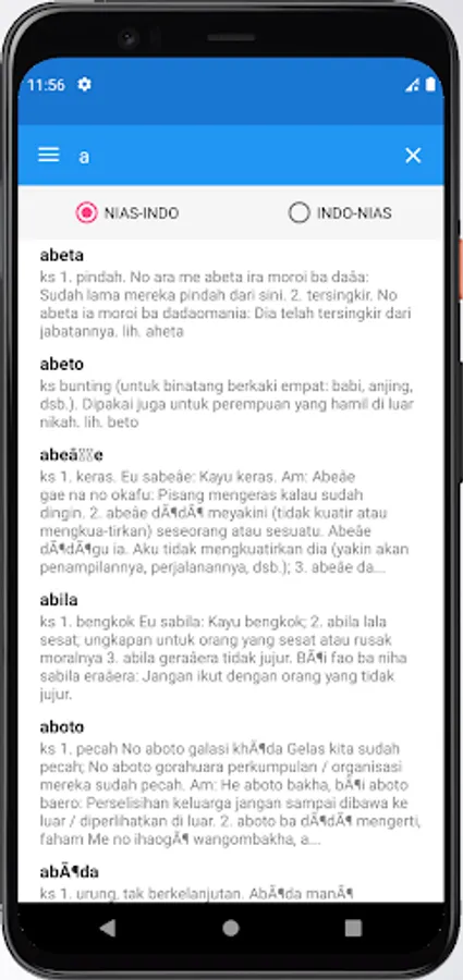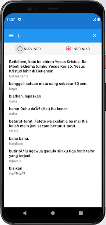 Nias Dictionary is the most comprehensive Nias language dictionary. Translation of Nias language to Indonesian or Indonesian to Nias. You can learn the Nias words and vocabulary online. We also provide examples that are often used in Nias language along with their meanings and usage in Nias customs. Nias Dictionary can be your reference in learning Nias language. Let us preserve Nias culture by continuing to learn and know the Nias language.