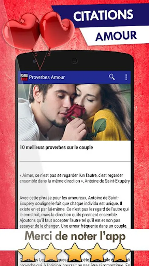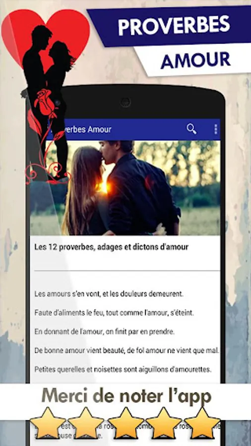 From now on you will not have any more problems with the messages and quotes of love, thanks to the application proverbs love, you will have a panoply of phrases and proverbs of love most attractive and most famous to say compliments to your friend or to your wife, declare your love to this girl or boy by surprising him or making him laugh, or simply phrases to express your feelings.