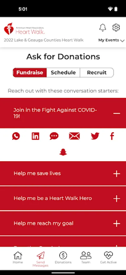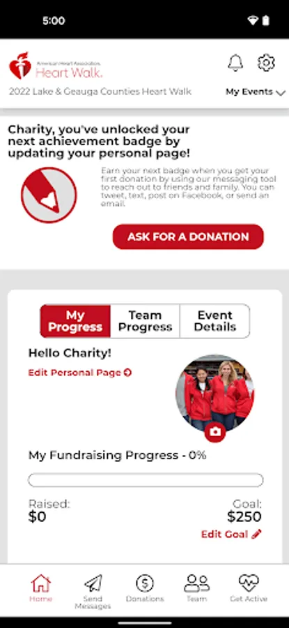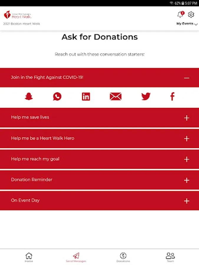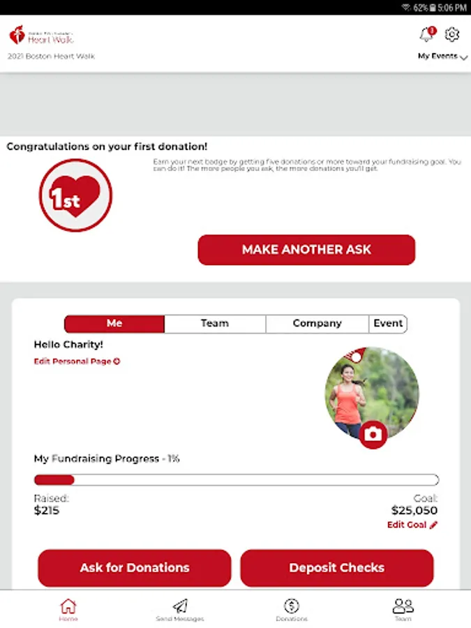 Make your recruitment and fundraising easier with the American Heart Association’s Heart Walk application. Update your story or photo, send pre-written emails and text messages, quickly and easily make posts to your social media channels and deposit checks right from your app! Monitor your activity by connecting to Google Fit to track your steps – all from the palm of your hand.