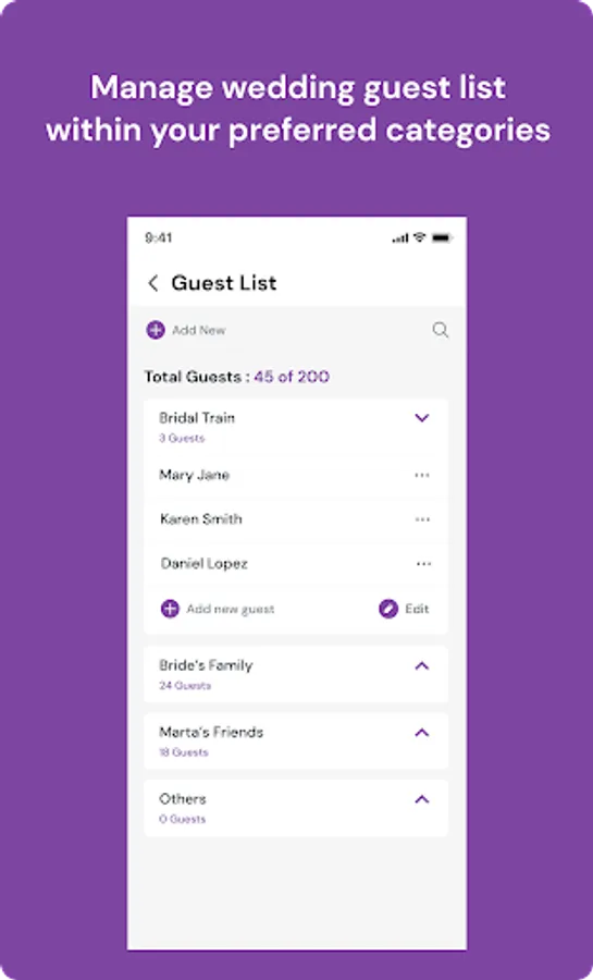 Manage Wedding Guest List: Couples & planners are able to manage wedding guests list and create categories.