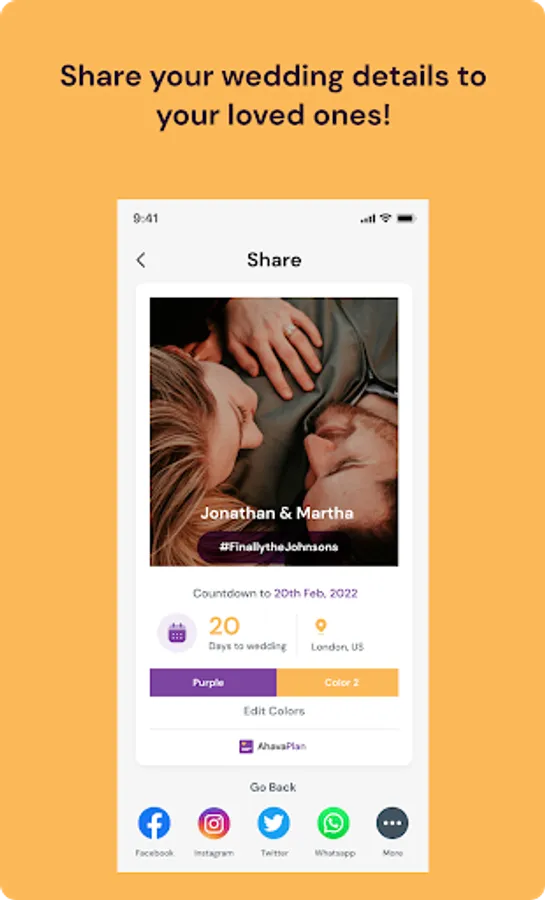 Shareable Wedding Profile: Share your wedding details to your social platforms or text messages as a reminder or quick informational messages to your wedding guests!