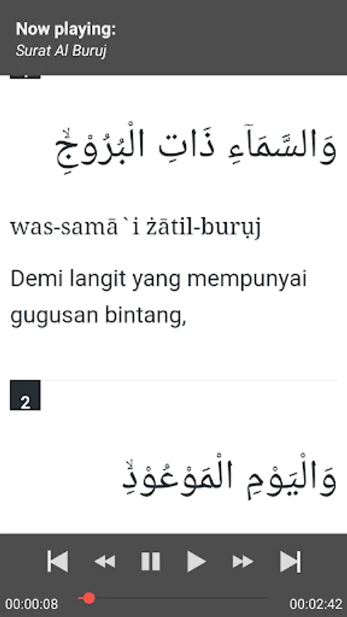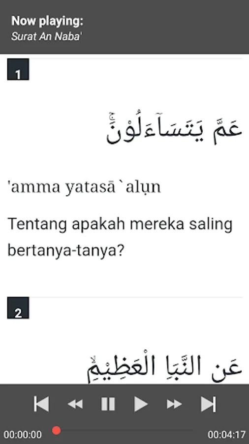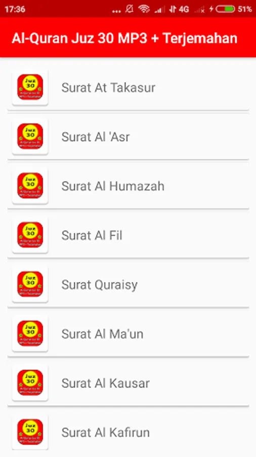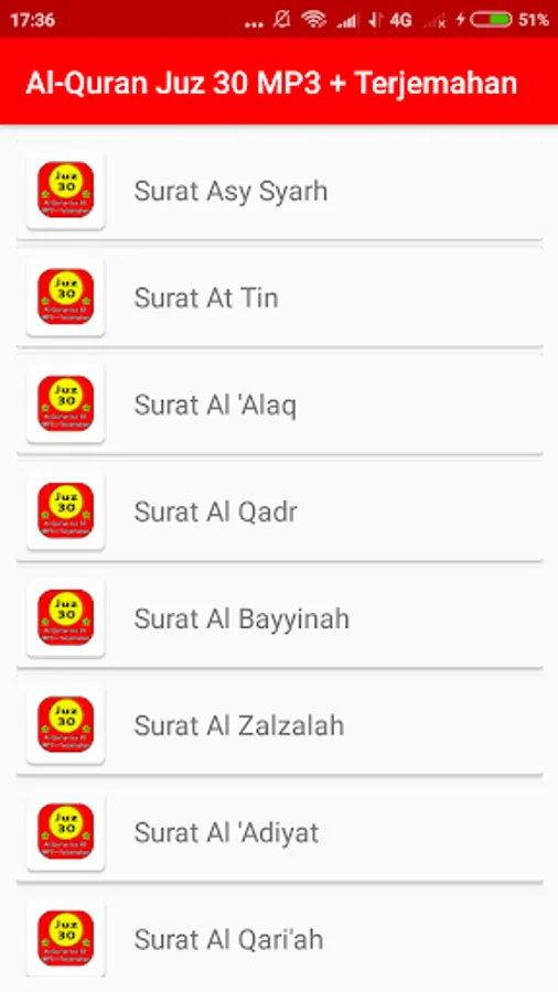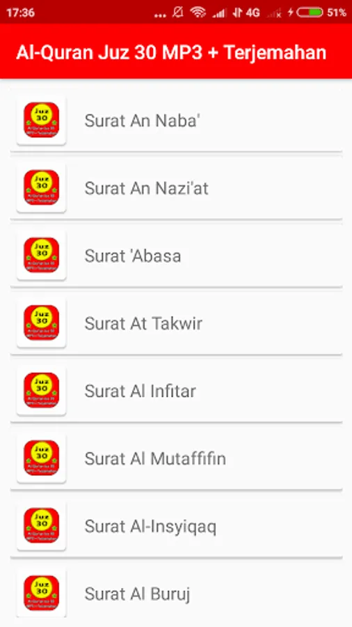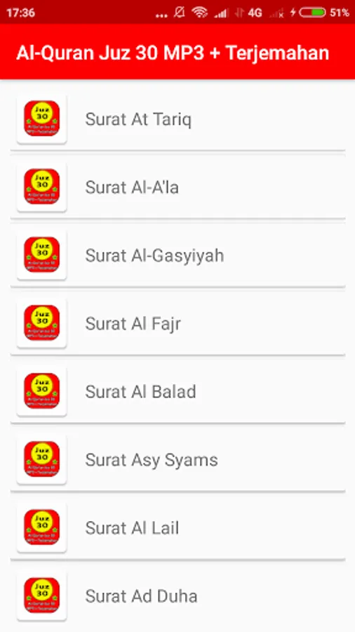 Al-Quran Juz 30 MP3 Offline Application + Translation is an application that contains audio reading, writing, and translation of the 30th Juz Al-Quran. This application is suitable for those of you who want to listen to the Koran, read the Koran, and memorize the Koran.