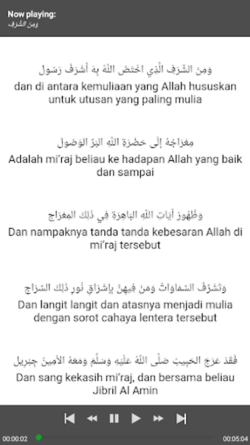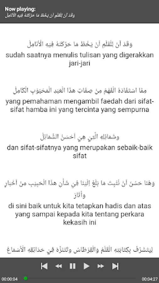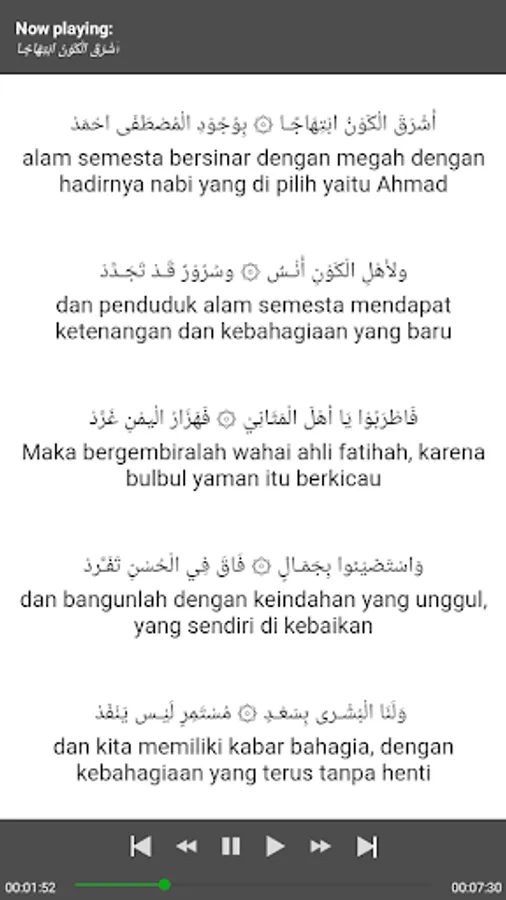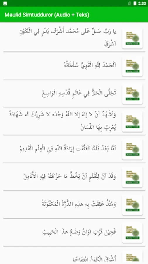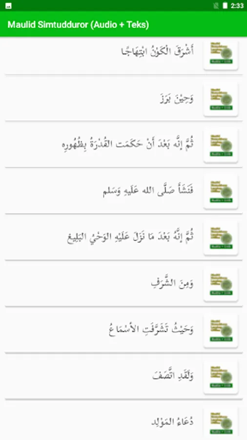 This Maulid Simthuddurar Audio Book application is an application that contains audio sound (MP3), Arabic text and Indonesian translation of the Maulid Simtudduror book. Sound and Audio in this application can be run offline without the need for an internet network connection. Some of its contents include: