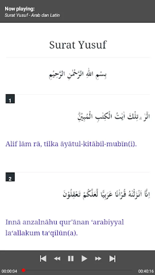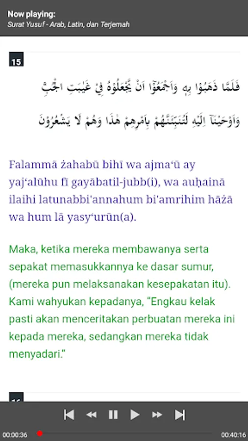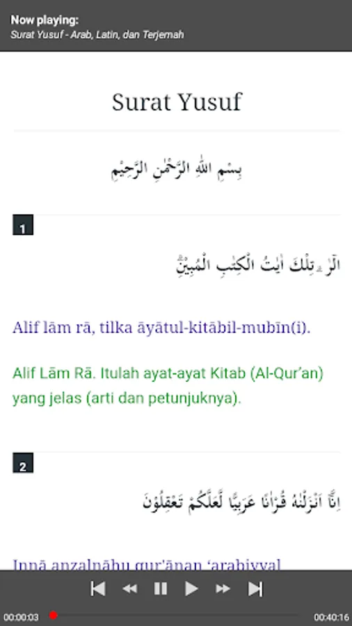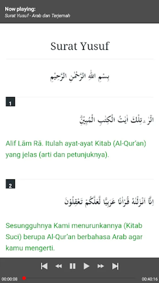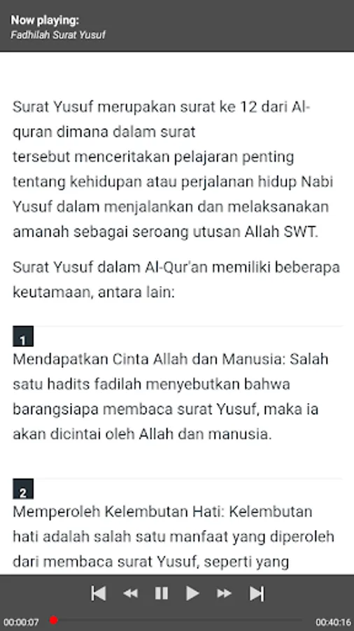 1. Audio Offline: Users can listen to the recitation of Yusuf's letter without the need to be connected to the internet.
