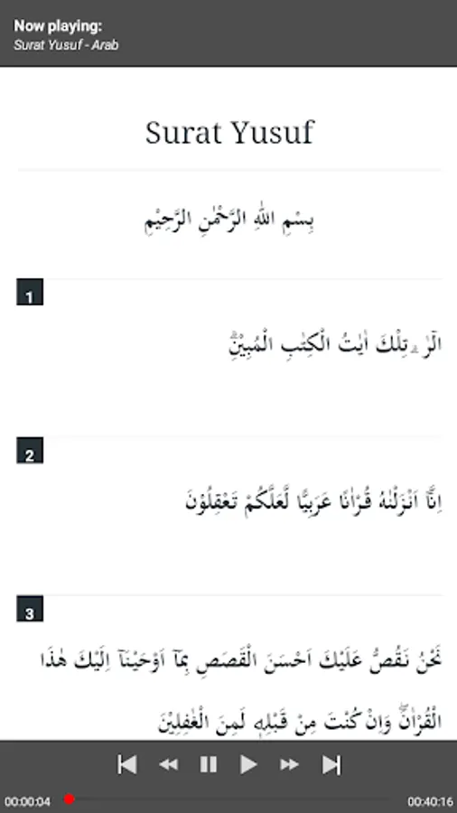 2. Audio Player: The application has an audio player that allows users to play, pause and replay the recitation of Yusuf's letter.