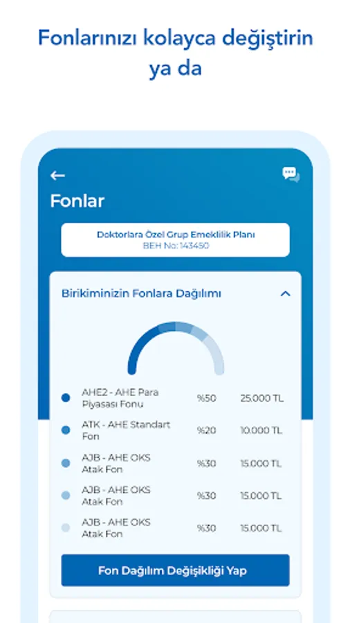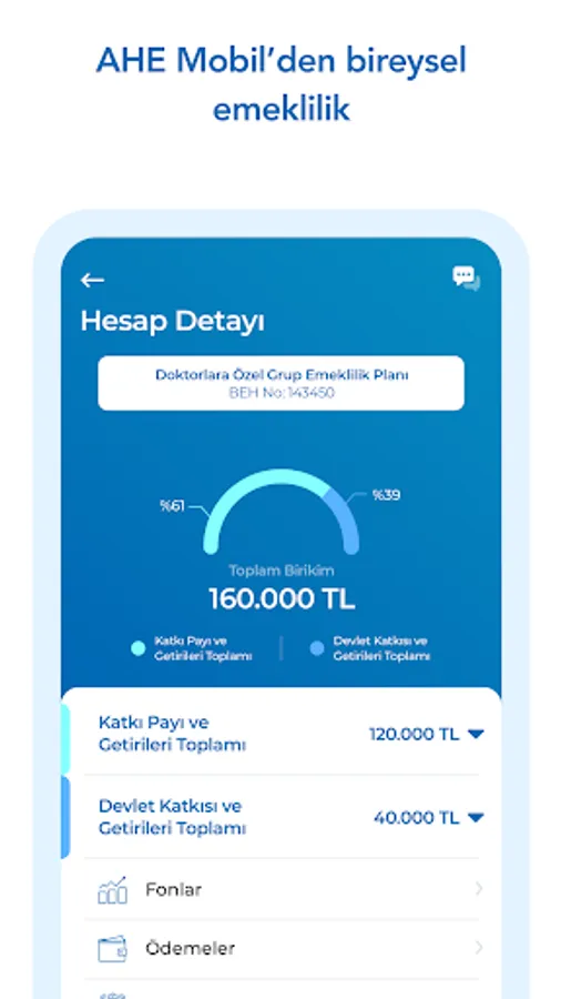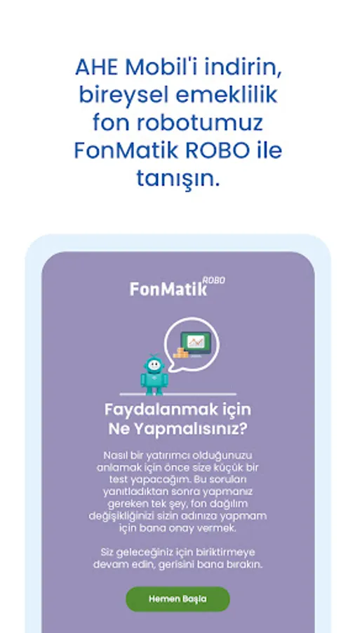 We renewed AHE Mobil for you! It is now much faster to access your private pension and life insurance information. Moreover, you can follow your savings, state contribution and returns with instant notifications and change your funds easily. Turkey's first and only fund the robot ROBO Fonmatik, AHE Mobile await you.