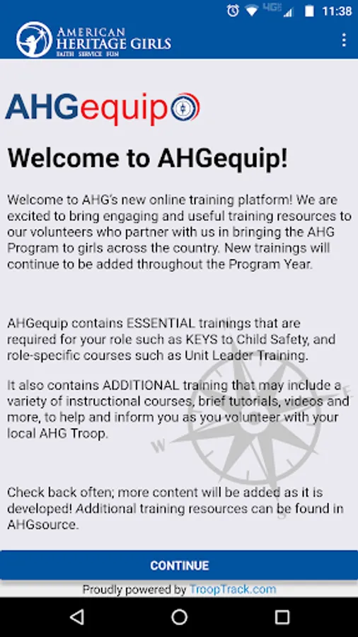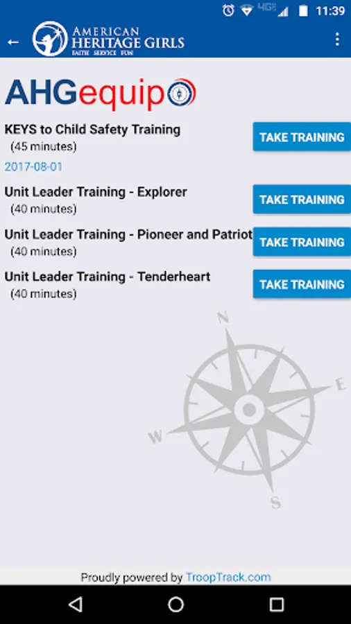 AHGequip is the training app for all Registered Adult Members of American Heritage Girls. Training resources available in the app equip volunteers to serve with excellence. Members can view instructional videos and tutorials, and complete required training for their role in the Troop. Well-equipped volunteers help provide a safe environment for Girl Members and allow the focus to be on the Faith, Service, and Fun!
