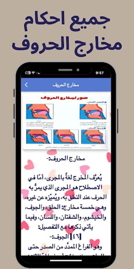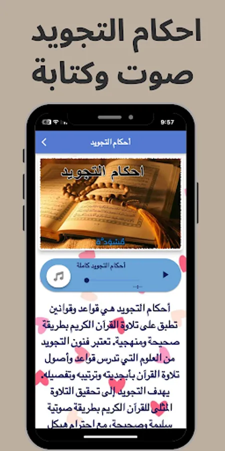 Enjoy learning and understanding deep details of the science of Tajweed and your intonation in reciting the Holy Quran. Learn how to pronounce each letter with all its characteristics such as lengthening, stopping, ghannah, lengthening, and phonetics, in addition to the appropriate rhythm to achieve the correct reading that God and His Messenger want.