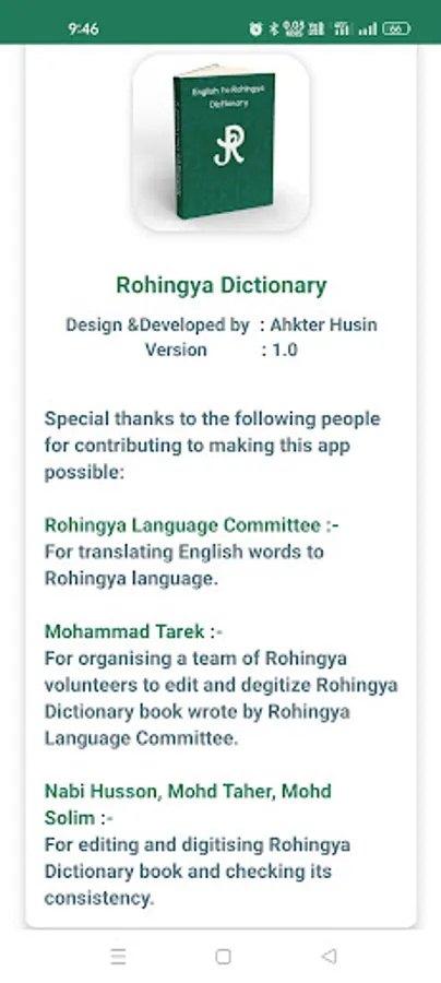 Myanmar is a country with an enormous diversity of cultures, but its indigenous languages are disappearing like all the other indigenous languages in the world. One of such languages under threat is Rohingya. Despite the existence of Rohingya's own language and script, they still aren't allowed to learn it since the Myanmar military regime systematically suppresses their freedom, life, and language. By developing this app, we are intended to preserve the spoken language of Rohingya ethnic minority which is about to extinct.