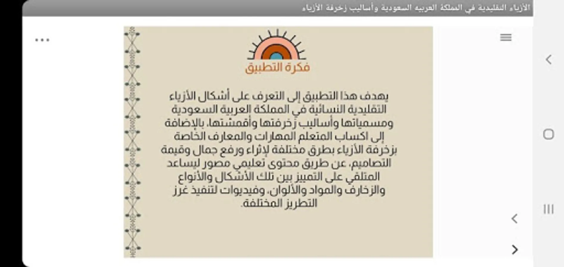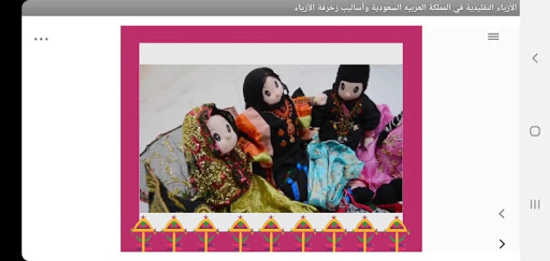 Some believe that the Kingdom is a barren desert, but the embroidered textiles have revealed a lot in their meanings about the nature of the Kingdom. ”Traditional clothing had a large share of this distinction, despite the fact that the clothes used in the regions of the Kingdom are united by a single unit in their general form, where they all share In her simple, primitive detailing lines, but there are clear differences between them in the methods of decorating them and the materials used in that .. We review here what the grandmothers' hand made of various decorating methods such as (patchwork, embroidery, added weaving, the use of beads of all kinds, dyeing, the use of knitel, tali and sequins. And the buttons, the added costs) that were the height of beauty and creativity despite the scarcity of capabilities and the simplicity of the tools (Saudi Arabia - 1989).