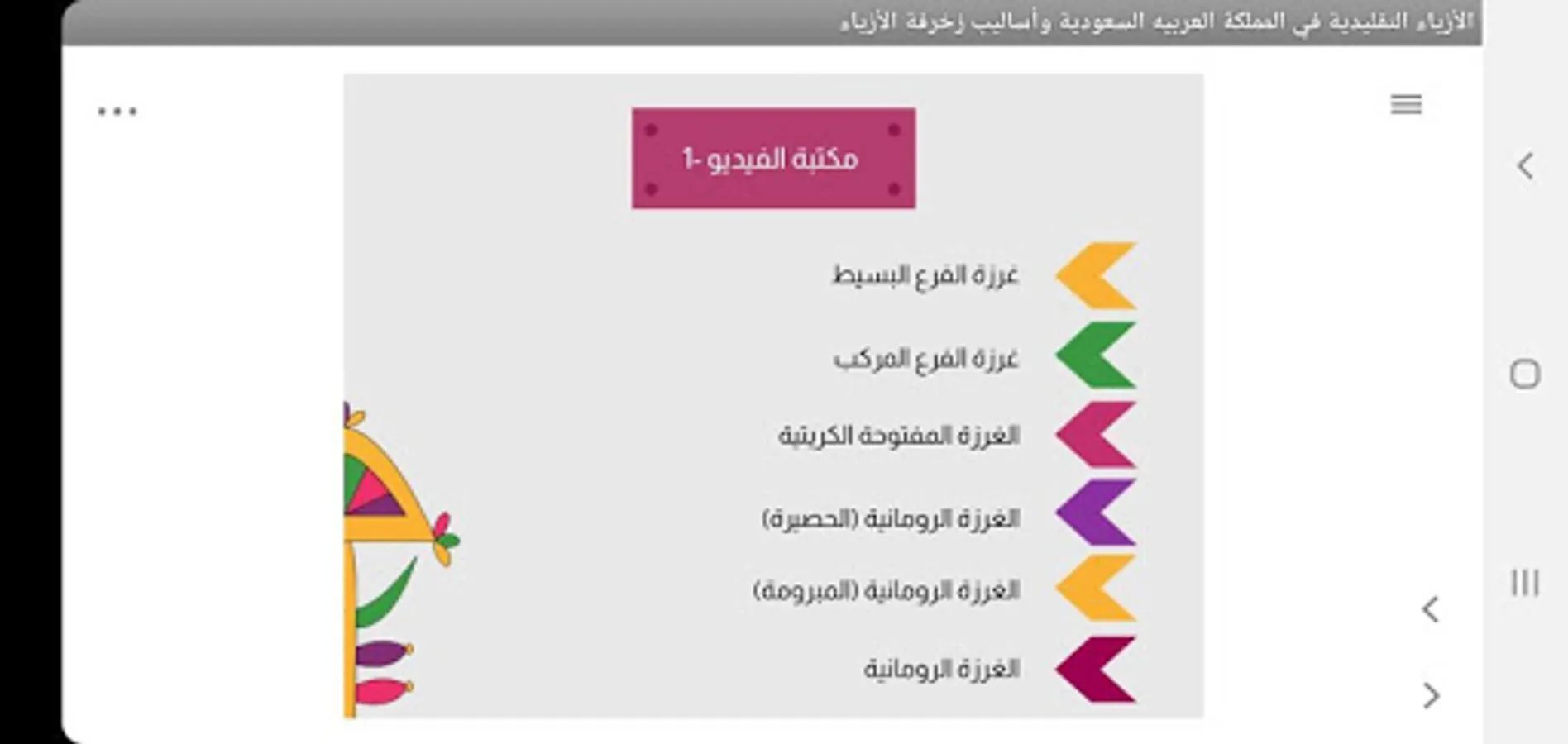 Decorating with needle and thread is an ancient female profession in which the Najdi woman excelled and spread on her clothes, as it was characterized by the intensity of embroidery in different places, and in addition to the aesthetic function of embroidery, it had another function, which is strengthening the edges and openings, fixing the adjacent pieces and fixing the lining, or covering the seams in the dress. (Al-Bassam -1403)