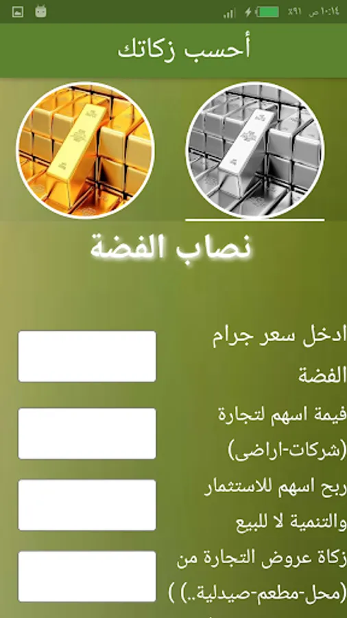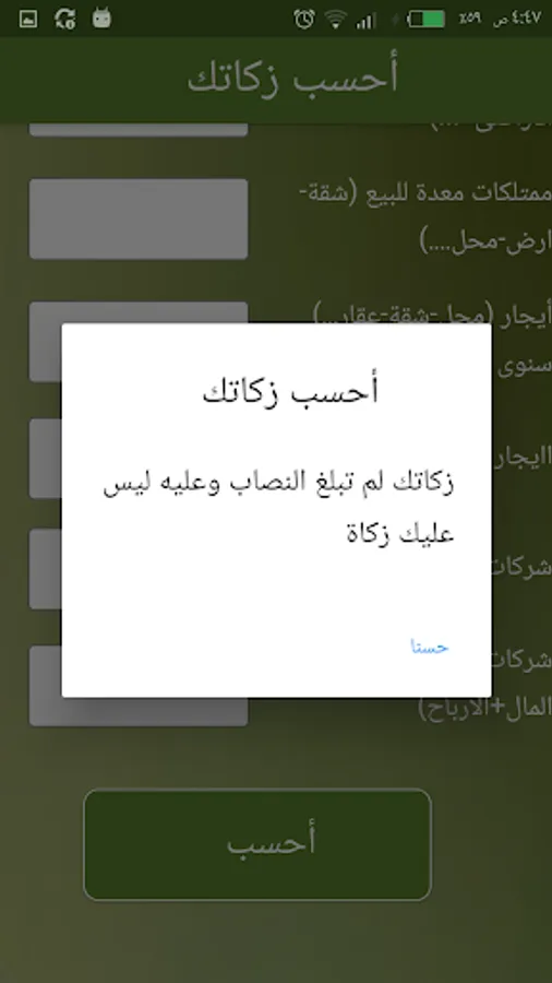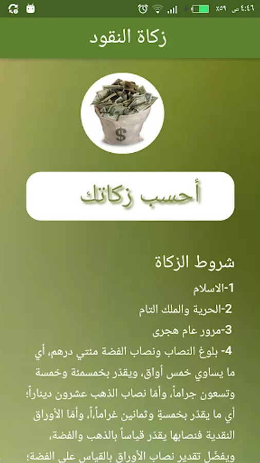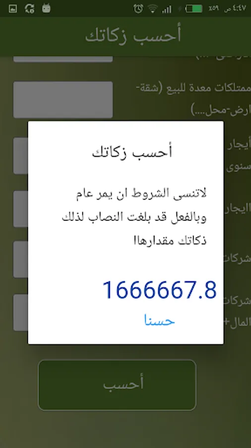 ويمكنك حساب الزكاة للممتلكات الخاصة بك أو الأسهم أو السندات بكتابة قيمة السهم أو السند، وبعد ذلك يظهر لك قيمة الزكاة الخاصة بها.وان لم يكن عليك زكاة فسوف يعرفك التطبيق انه ليس عليك زكاة