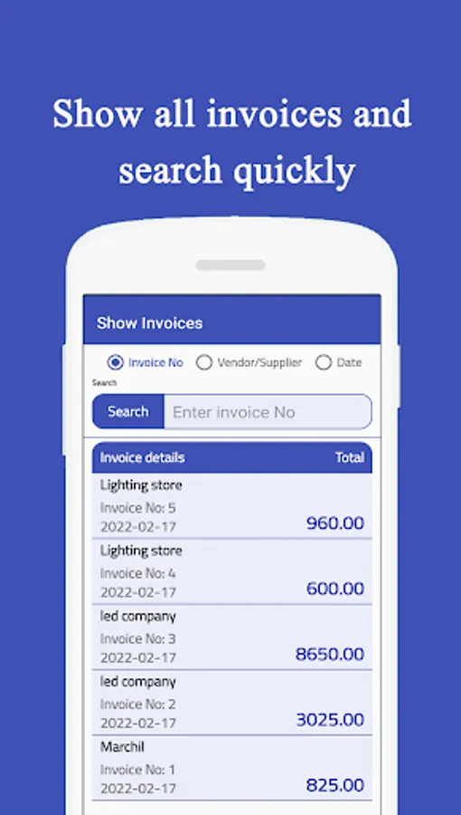 You can quickly find which invoic e you want by invoice date, invoice number or vendor/supplier name.