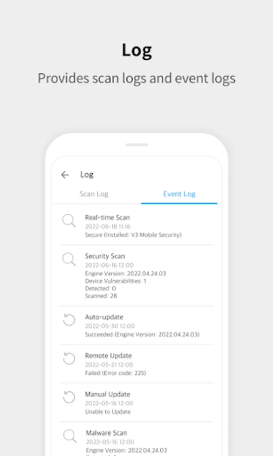 - Log: provides scan logs generated when detecting threats, and event logs created when events in relation to the scan occurs