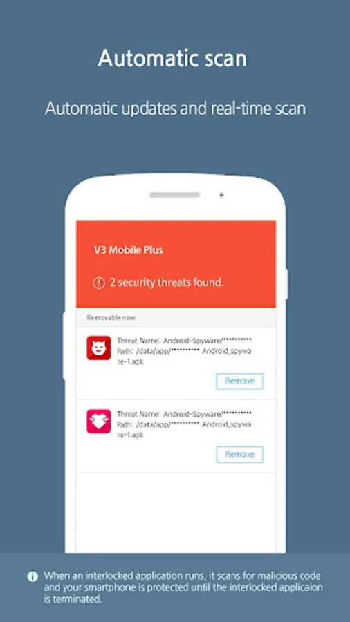 When you open an application interlocked with V3 Mobile Plus, the anti-virus engine will get updated to the latest version, and Real-Time Scan will scan your device for malware. When a malicious file is detected, you can remove it immediately.