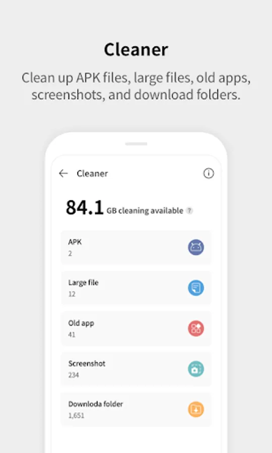 • Clean up APK files, large files, old apps, screenshots, and download folders!