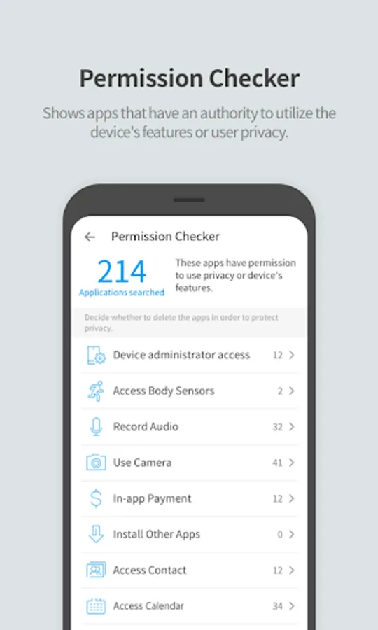 - App authority checker: Shows apps that have an authority to utilize the device's features or user privacy.