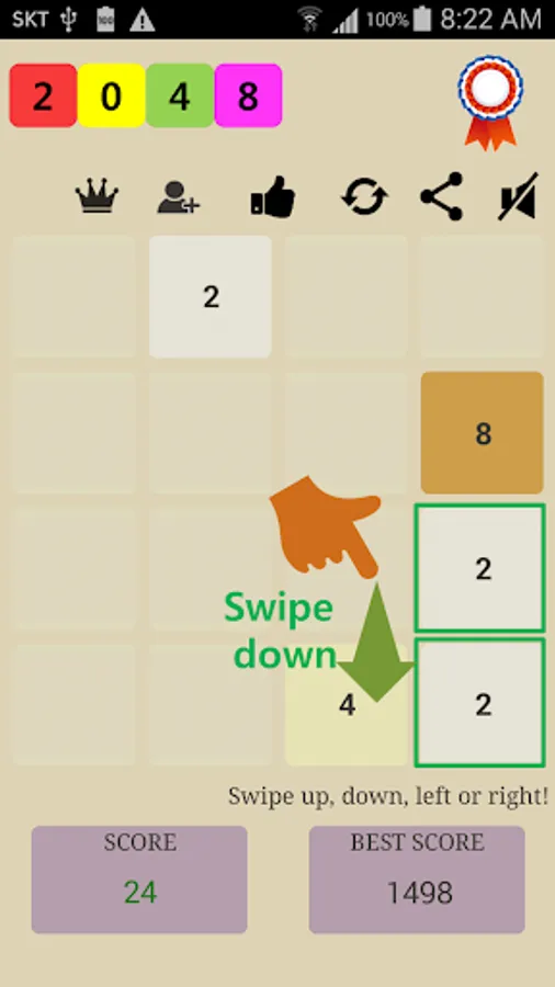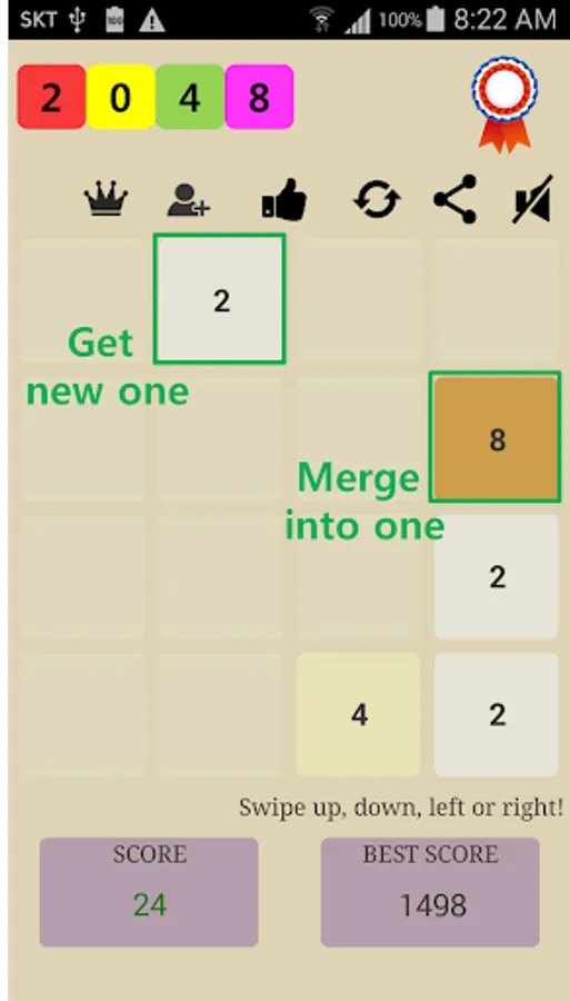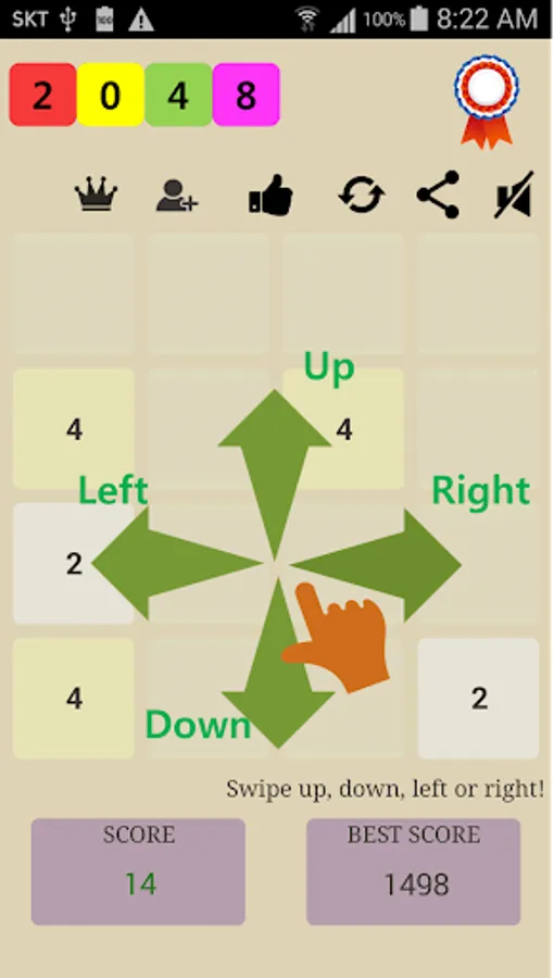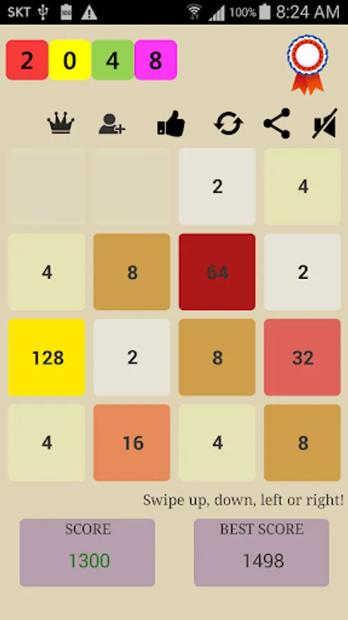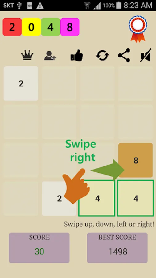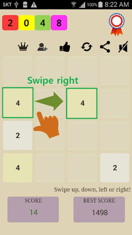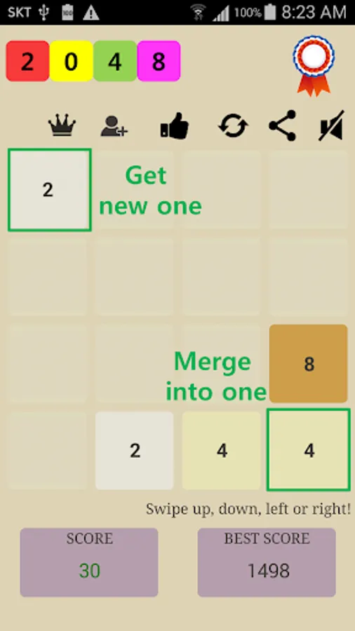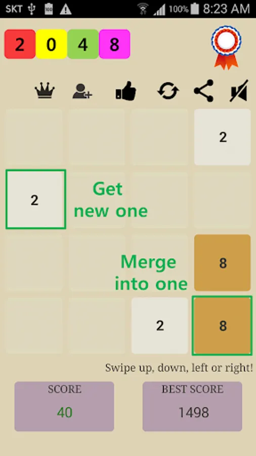 Swipe up, down, left or right to get the 2048 tile! When two tiles with the same number touch, they merge into one.