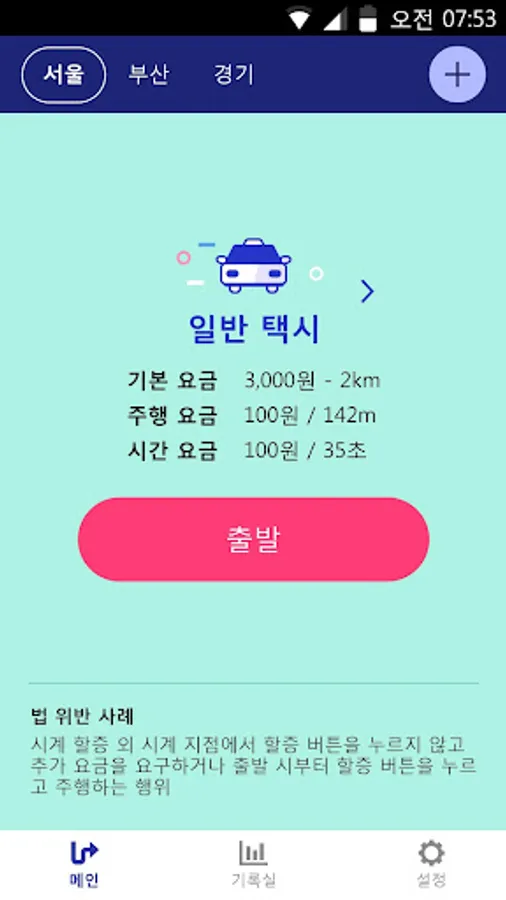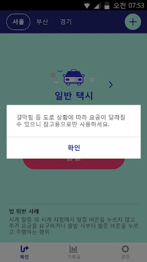 The taxi fare system has been applied based on the data of the "Korea National Joint Conference for Taxi Association". May have a different fee structure applied by municipalities, and if the fee structure is different, there may be a difference in the measured amount. Surcharge applies to 20%, and the batches does not support multiple premium (40% ~ 63%) in rural areas of each section. The taxi fare measurements, errors can occur, and depending on the status of the GPS signal may not be the same as the actual taxi fare. Taxi fares and Go Records may be used for informational purposes only and shall not be responsible in case of any legal dispute.