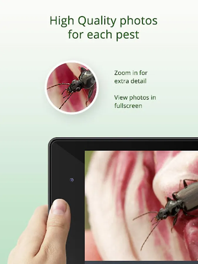 - HIGH QUALITY photos for each pest that can be viewed in fullscreen and zoomed in.