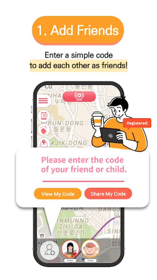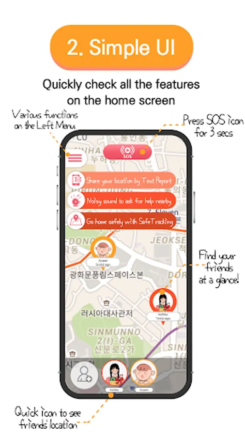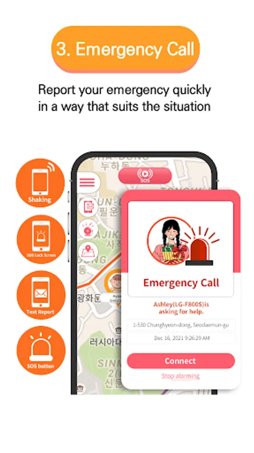 By pressing the "SOS button" in an emergency, full screen pop-ups of Emergency Call appears immediately to your friends.