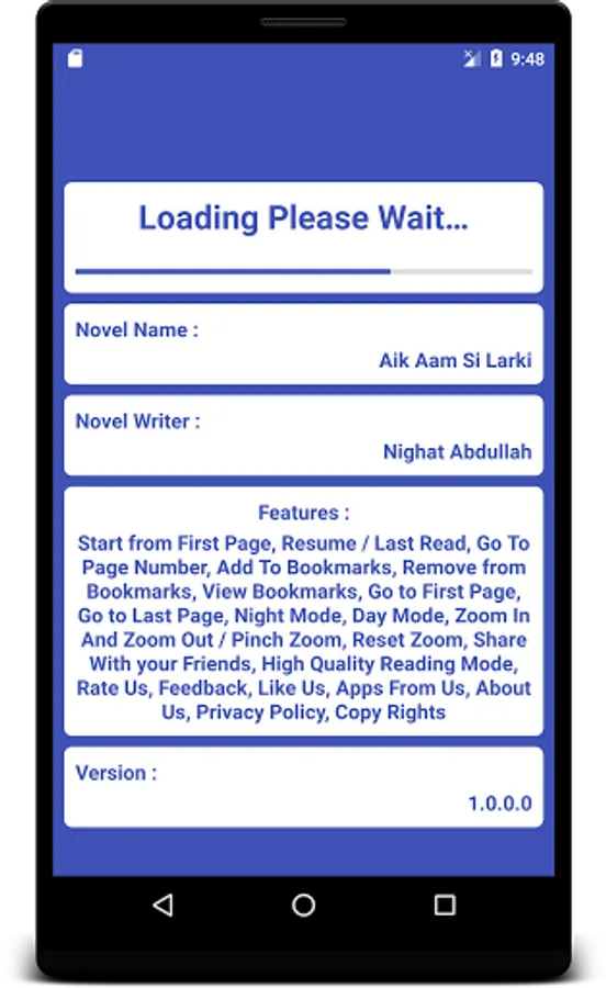 This application consists following features and functionalities. One of the most imortant feature is page navigation. We allow users to read from last position and provided "Go To Specific Page" feature to move to any page. An other important feaute is to provide user friendly screen transition. In the settings screen, user have many options to make its own setting for this novel which includes "High Quality Reading Mode", "Zooming Controls", "Day and Night Mode", Novel Reading mode (Portrait and Landscap).