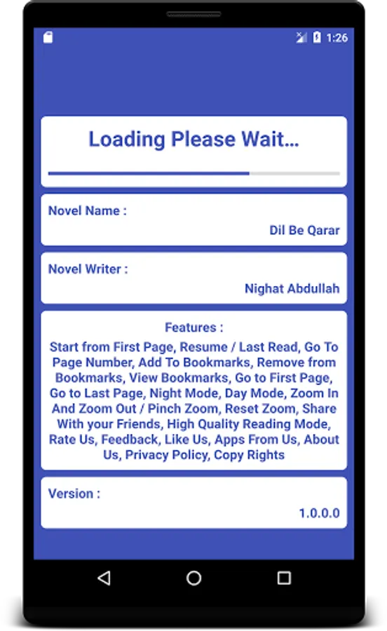 This application consists following features and functionalities. One of the most imortant feature is page navigation. We allow users to read from last position and provided "Go To Specific Page" feature to move to any page. An other important feaute is to provide user friendly screen transition. In the settings screen, user have many options to make its own setting for this novel which includes "High Quality Reading Mode", "Zooming Controls", "Day and Night Mode", Novel Reading mode (Portrait and Landscap).