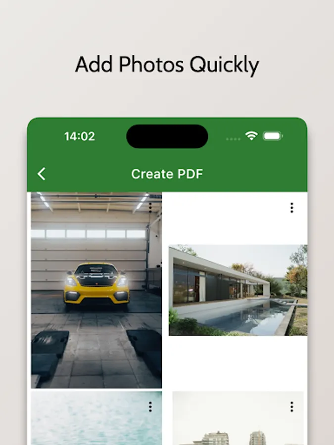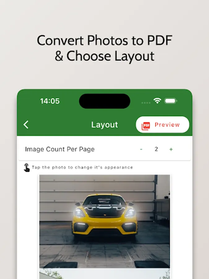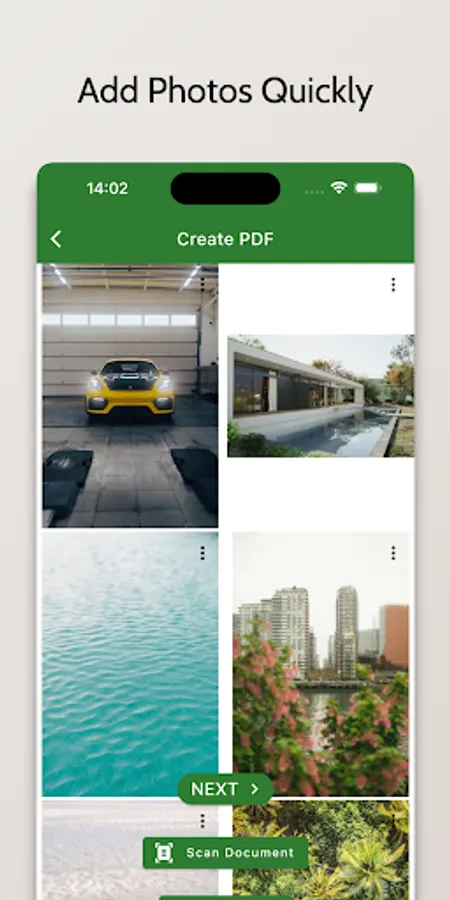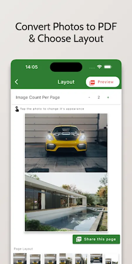 Use "Photos to PDF Converter & Scan" to scan photos or documents from your camera or add them from your photo gallery. Choose the count of photos per page and select layout of pages, including pre-defined Photo Grid layouts. You can resize images with medium or small file size option and choose to fit or fill the image on the page or in the Photo Grid by tapping the photo.