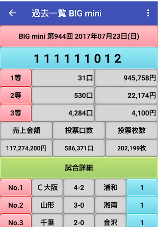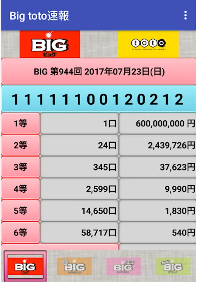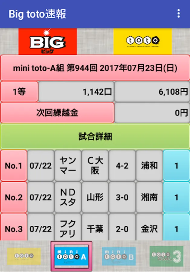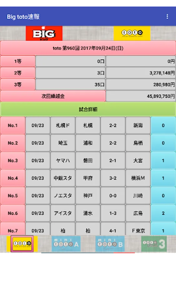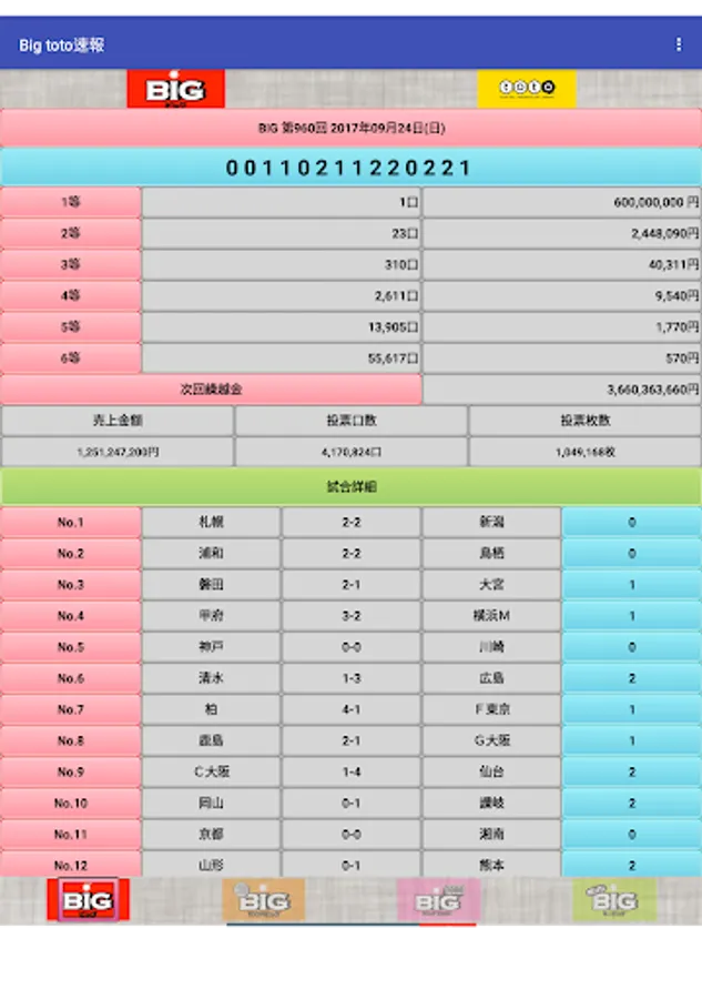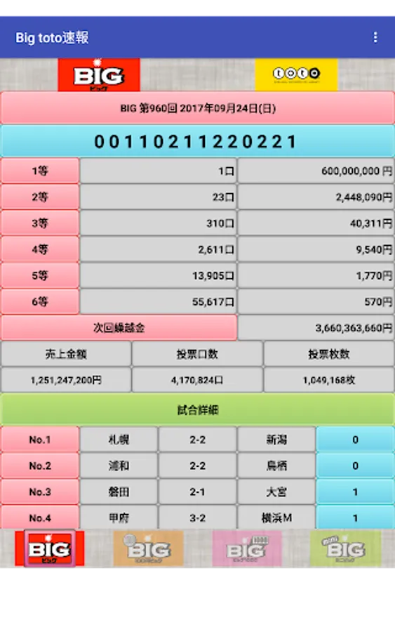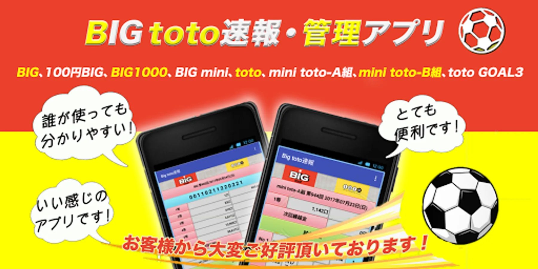 BIG toto bulletin management application corresponding to BIG, MEGA BIG, 100 yen BIG, BIG1000, BIG mini, toto, mini toto-A group, mini toto-B group, toto GOAL3!