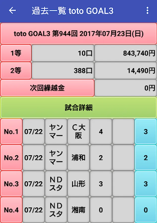 When the results of the soccer (J-League) match are confirmed, the match results, the number of winning units, the winning amount, and the amount carried over to the next time will be announced as a flash report.