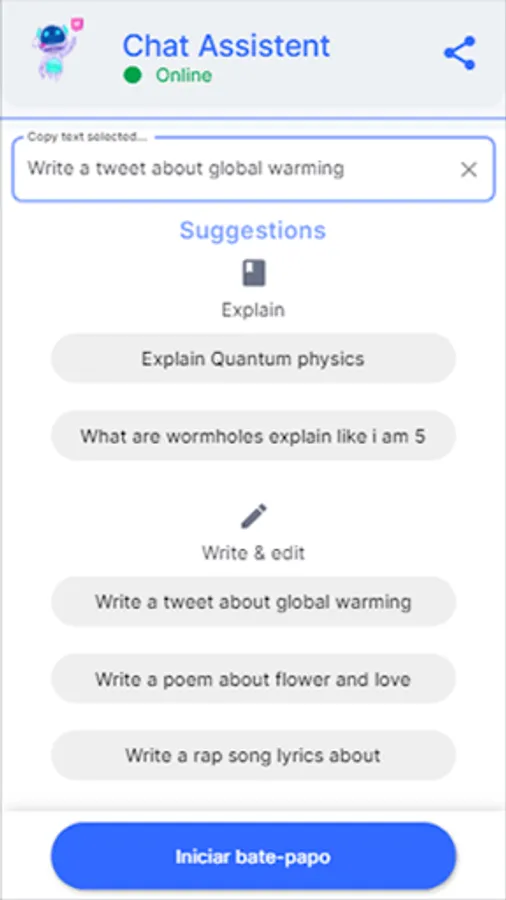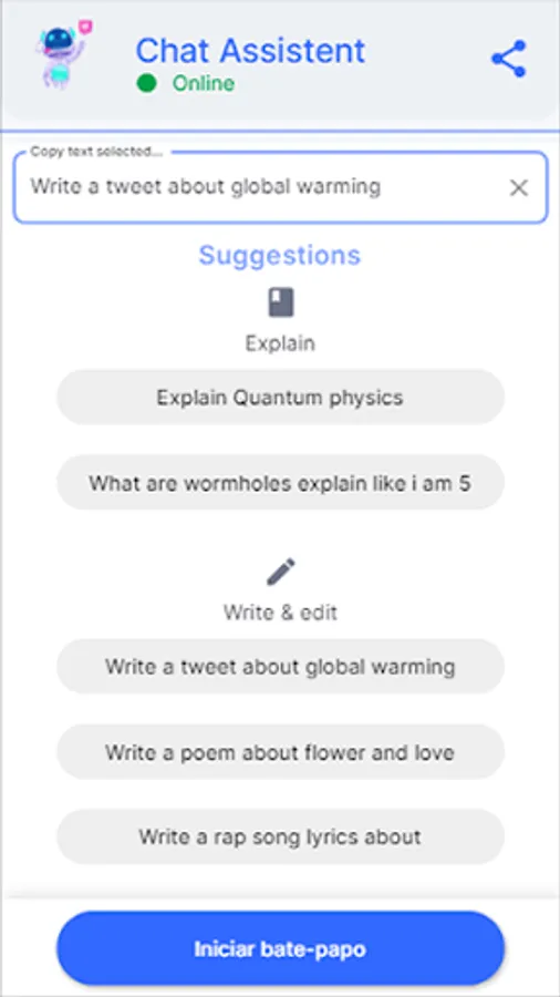 Chat Assistant AI: The app uses Chat GPT 3.5 Turbo model. Get instant and smart answers with AI Chat! Experience the future with our Chat Assistant AI, powered by ChatGPT 3.5 turbo technology, offering interactive and fun conversations that will make you more productive. So if you are a tech enthusiast, professional or looking for a personal AI assistant.