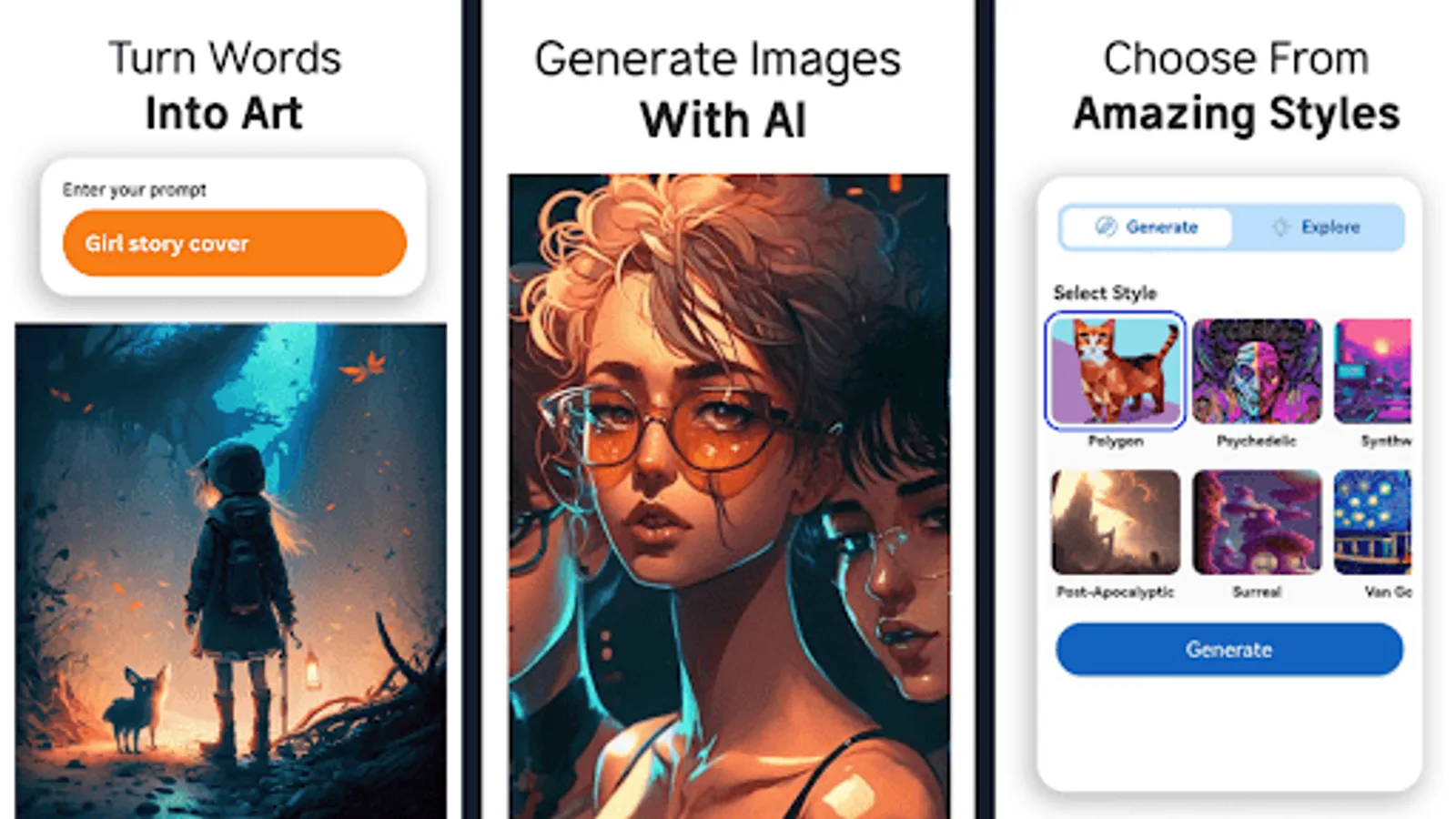 AI Image Generator Turn words into photos & beautiful digital artworks using the power of AI! All you need to do is enter a prompt, pick an art style - and watch AI Image Generator - AI Art Generator bring your idea to life in seconds. Do you want to create a photo, picture, drawing or painting that is your art work? AI Image Generator - AI Art Generator is an art station for you. You can turn text into any image or photo you want.