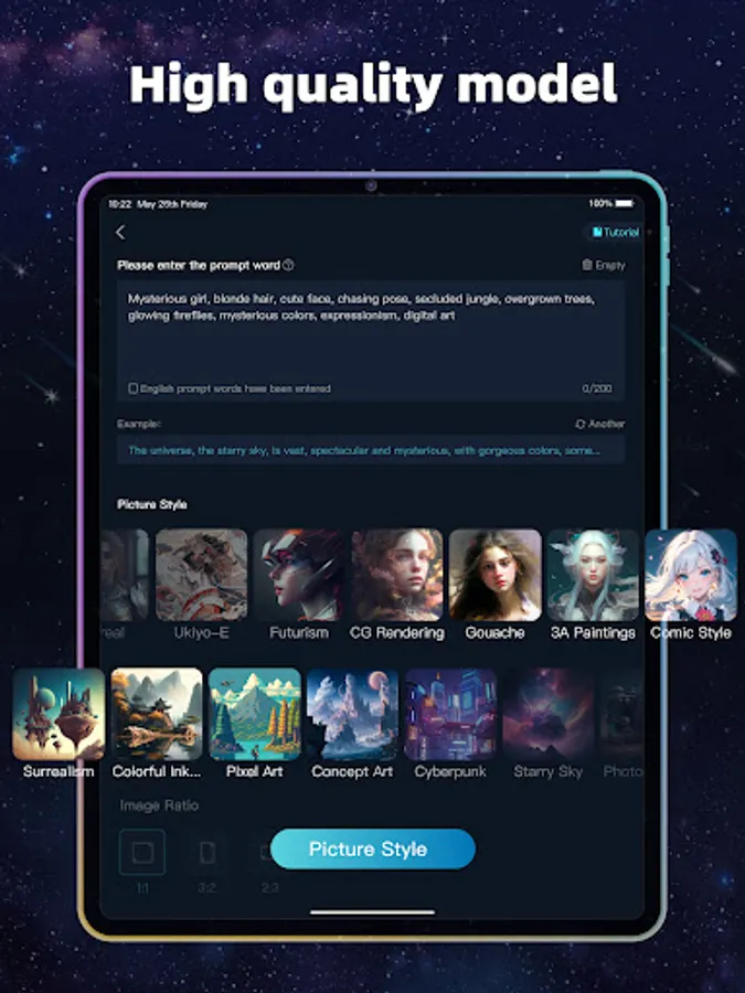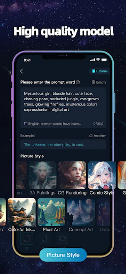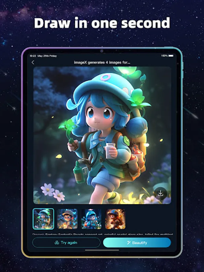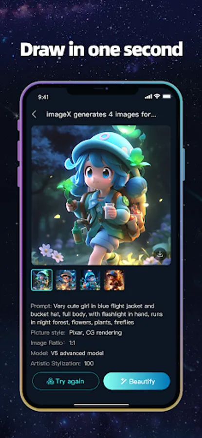 As a powerful intelligent drawing tool, imageX provides a wealth of picture styles for you to choose from, including but not limited to: real-life comics, Chinese costumes, two-dimensional, gouache, real-life 3D, cyberpunk, concept art, etc. Just enter text easily, AI art can bring you different styles of picture generator effects.