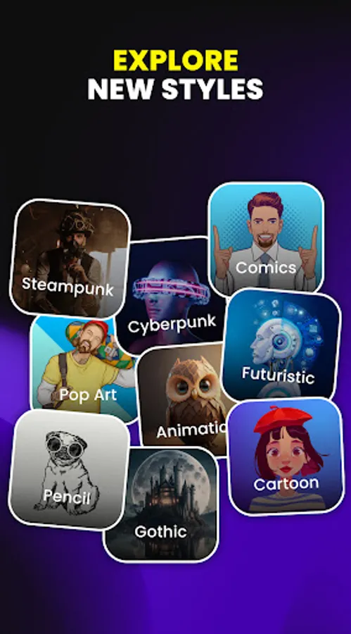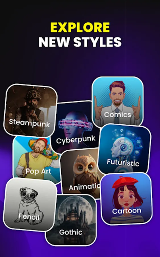 The AI generator application offers a wide range of creative styles for users to choose from, including pop art, steampunk, cyberpunk, comics, and cartoon. Each style has its unique characteristics and might be used to design stunning and eye-catching pictures. Pop art is a colorful and bold style that incorporates elements of popular culture, while steampunk and cyberpunk feature futuristic and industrial elements. Comics and cartoon styles are great for creating a fun and whimsical illustrations. With so many styles to choose from, consumers can experiment with different combinations and make truly original and captivating art made by AI.