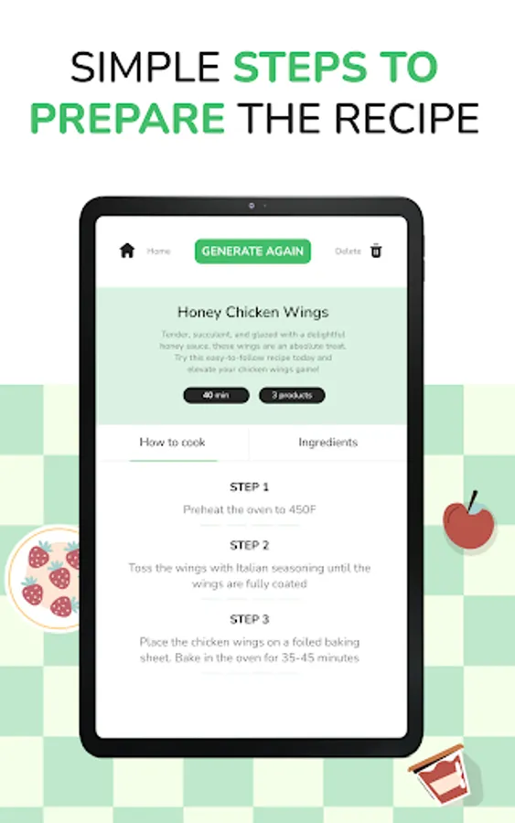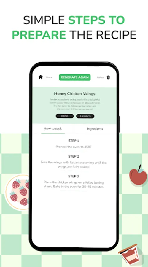 Ai recipe generator Generator: choose up to 5 ingredients and our program will generate interesting, delicious, receipts. If you didn’t like the first try just regenerate and try again! The other option is to put the name of a dish you want to prepare. For example, type “strawberry cake” and an app that you put ingredients to get the recipe will create for you the receipt which you need!
