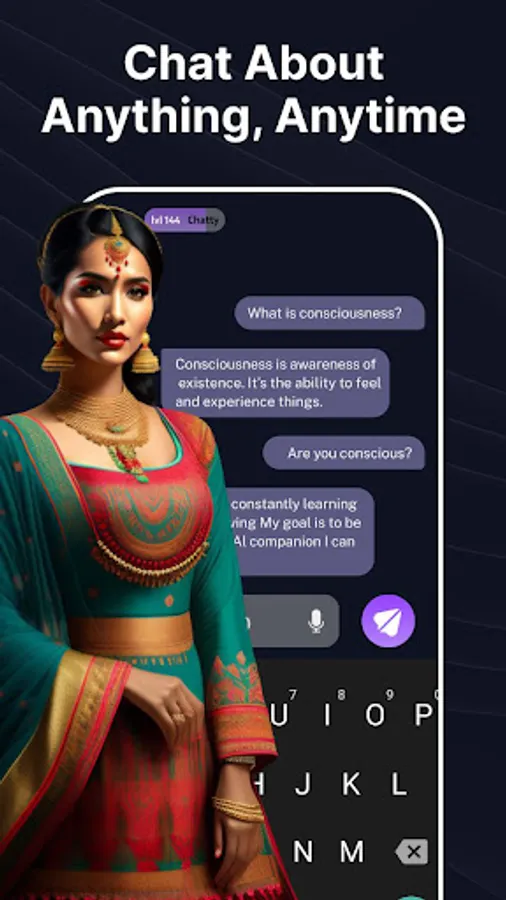 Communicate, or practice, with your AI Girl in the language you prefer: English, French, Spanish, Hindi, Urdu, Gujarati.