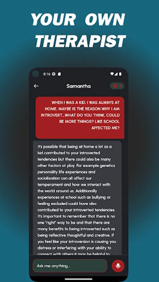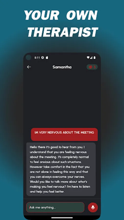 🤝 Crafted with Care by Therapists: Traditional CBT was once limited to weekly sessions with a therapist. Now, with Samantha, top-tier therapy is at your fingertips, anytime, anywhere.