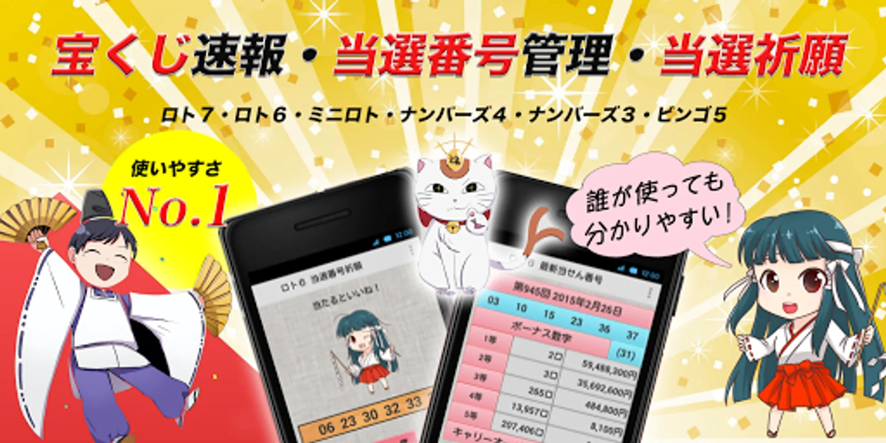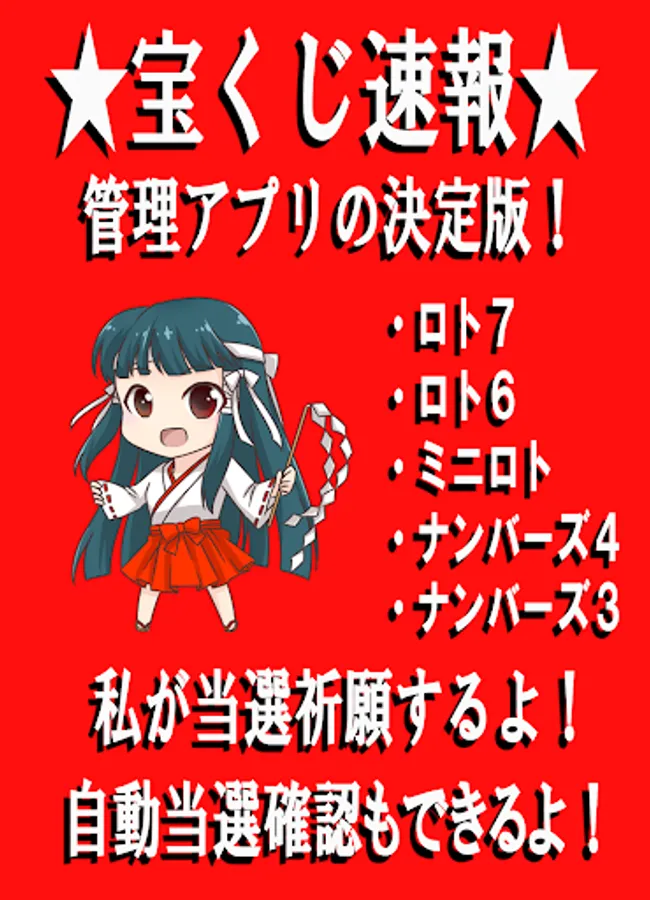 Lottery bulletin and management app for Lotto 7, Lotto 6, Mini Lotto, Numbers 4, Numbers 3, Bingo 5, and Dress-up Ku-chan!