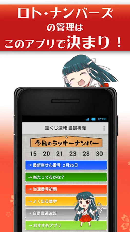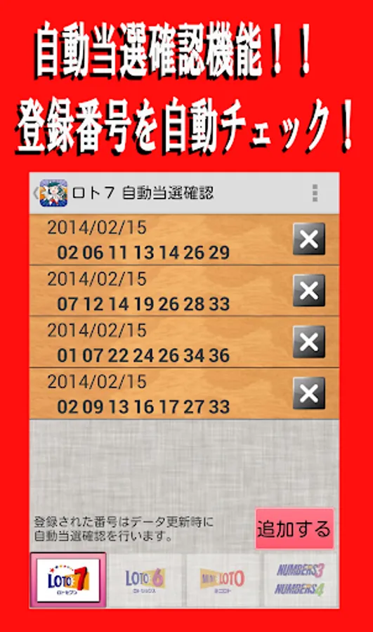 In addition to the latest winning number notification function and the check function to check if the selected number has been won in the past, it is equipped with an automatic winning confirmation function to register the number you want to check in advance and check if you have won. I will.